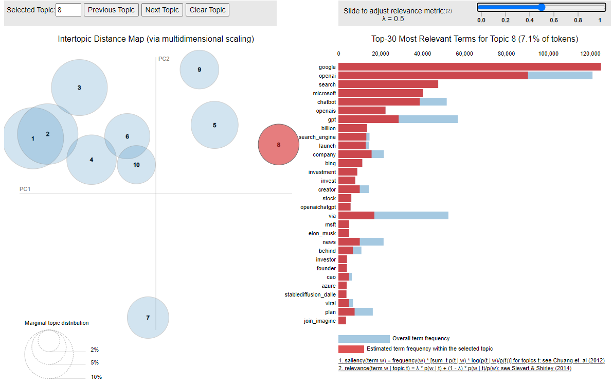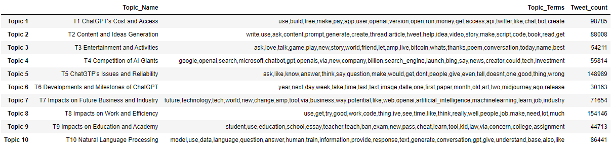 - Topic T5 ChatGPT’s Issues and Reliability and T9 Impacts on Education and Academy received relatively more negative sentiment, approximately 46% and 30%, resperctively. This indicates that there is room for improvement in terms of user experience, system stability, watermarking for preventing plagiarism, etc.