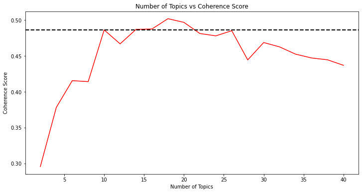 - Conducted a series of experiment by varing the number of topics (N) from 2 to 40, and obtained a relatively high coherence score for the range of 10 to 18 topics.